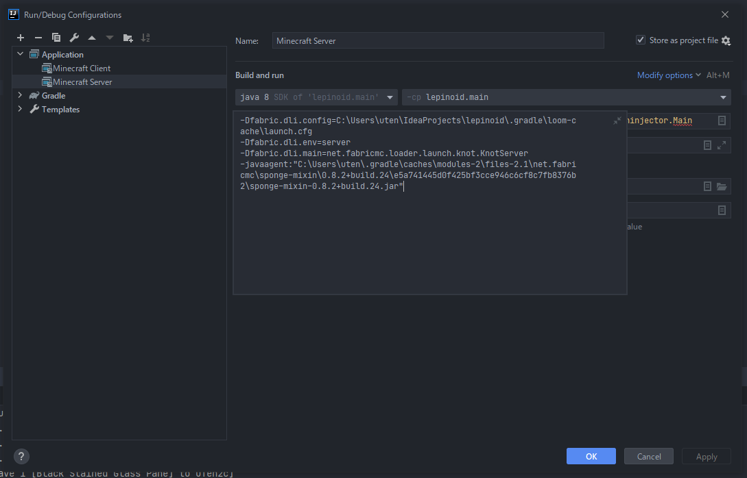 コピーしたらMinecraft Serverの実行構成を開いてVMオプションを開いて-javaagent:"コピーしたパス"の形で追加します。