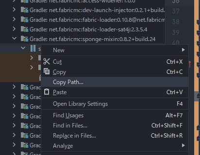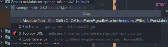 IDEの左側の下の方にあるExternal Librariesからsponge-mixinうんたらを探してjarのパスをコピーします。